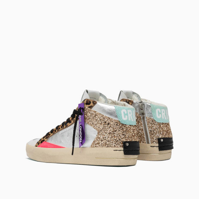 Deportiva CRIME LONDON bota, print, glitter dorado, plateadas, rosa y azul, etiqueta morada.