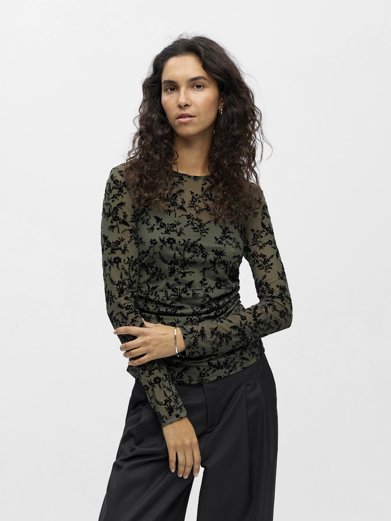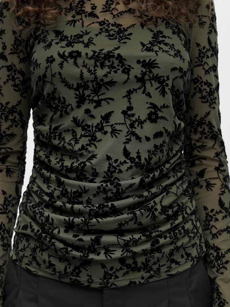 TOP CON DETALLE TIPO JACQUARD, CUELLO BARCO , MANGAS LARGAS SEMITRANSPARENTES , DRAPEADO EN LOS COSTADOS, FORRO, COLOR VERDE MUSGO CON DETALLES EN COLOR NEGRO.