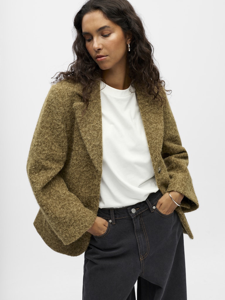 BLAZER LARGO CON BOTONADURA SENCILLA , SOLAPA DE MUSCA, MANGA LARGA , CIERRE DE DOS BOTONES, BOLSILLOS DELANTEROS DE OJAL CON SOLAPA, FORRO, CORTE HOLGADO.