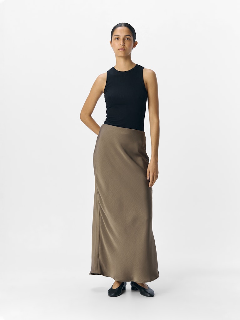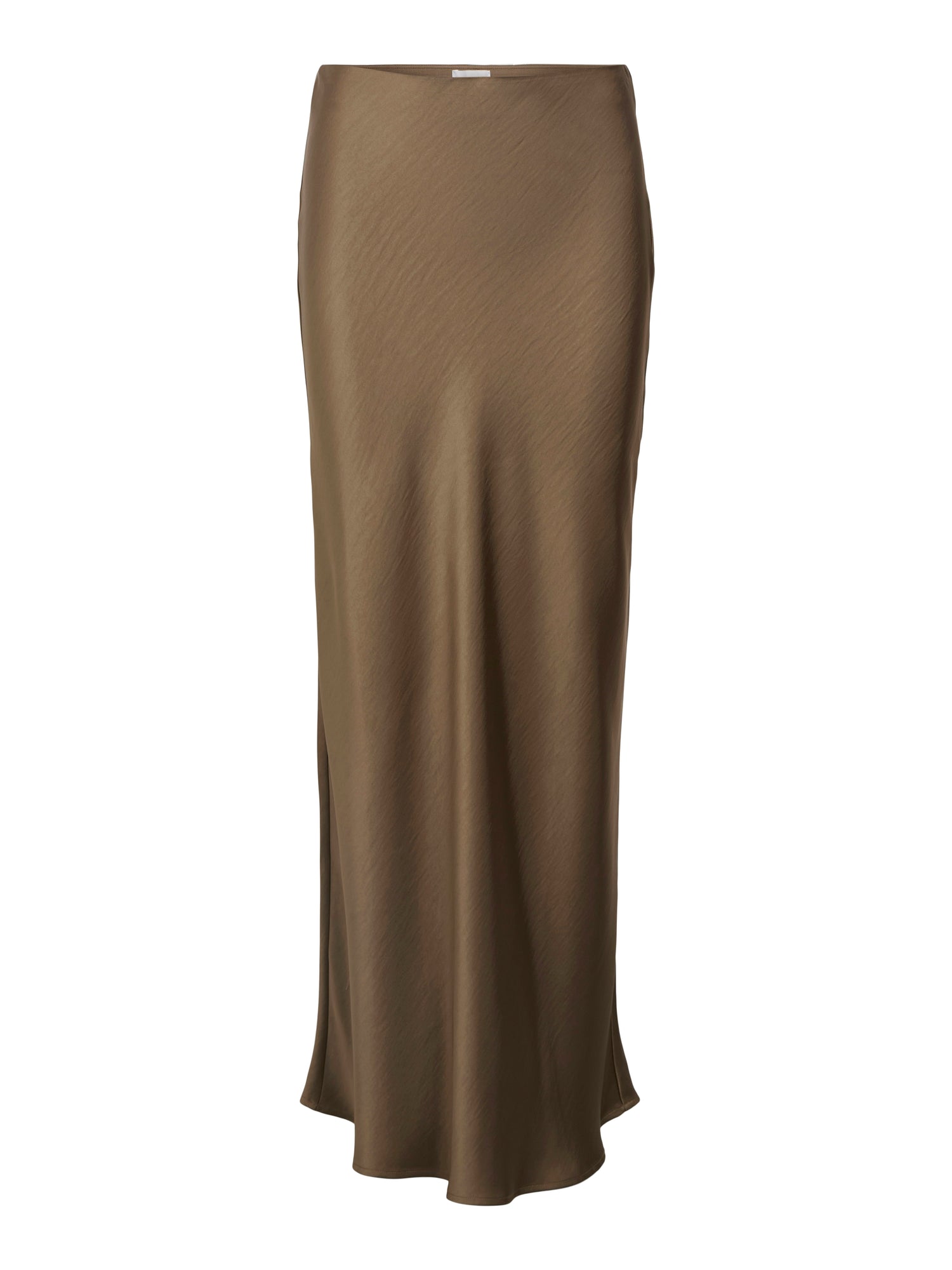 FALDA LARGA DE SATÉN, CINTURA ELÁSTICA DE TALLE MEDIO, CORTE REGULAR , COLOR TOPO.
