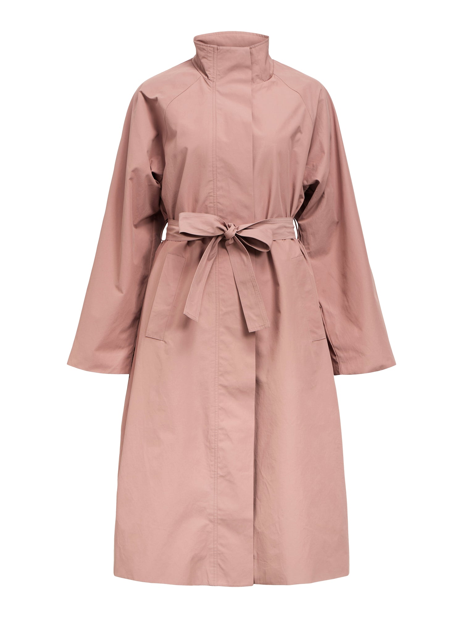 GABARDINA LARGA CUELLO ALTO, CIERRE FRONTAL CON BOTONES OCULTOS, MANGAS LARGAS, BOLSILLOS DELANTEROS , FORRO COMPLETO, CINTURÓN DESMONTABLE, CORTE HOLGADO, COLOR ROSA MAQUILLAJE.