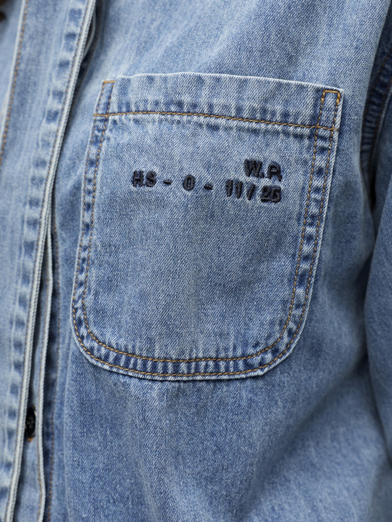 CAMISA DENIM , MANGAS LARGAS , CIERRE DEL PUÑO CON BOTÓN, CIERRE CON BOTONES, LAZO DENIM DESMONTABLE, CORTE REGULAR .