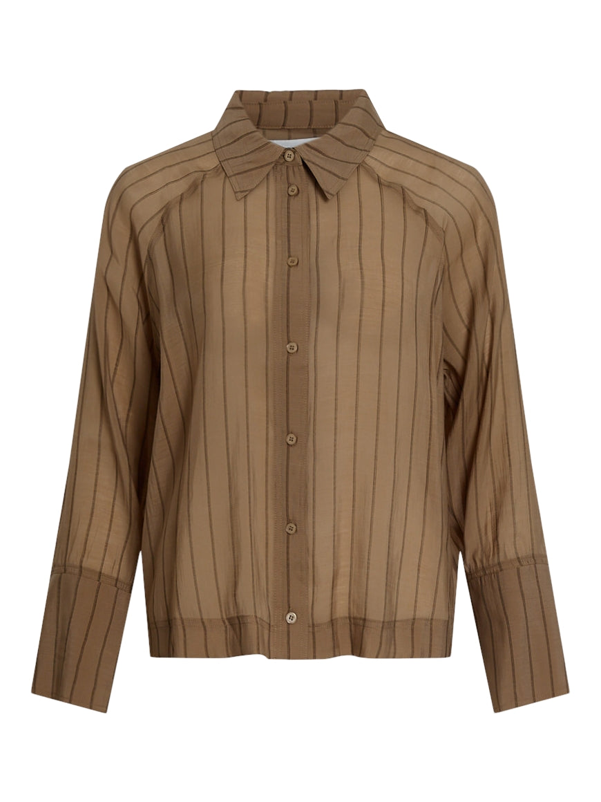 CAMISA DE RAYAS, CIERRE FRONTAL CON BOTONES, TEJIDO SEMITRANSPARENTE, CORTE REGULAR, COLOR TABACO CON RAYA NEGRA .