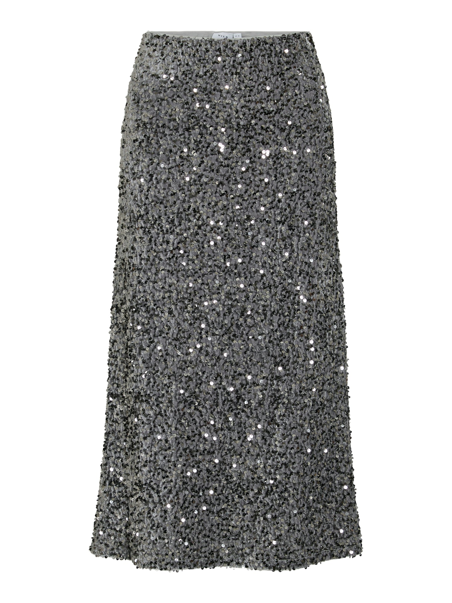 FALDA RECTA CON GOMA EN LA CINTURA , LENTEJUELAS EN TONOS GRISES , ABERTURA EN LA PARTE TRASERA , CORTE REGULAR