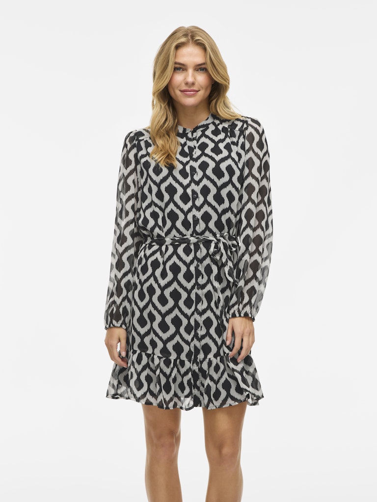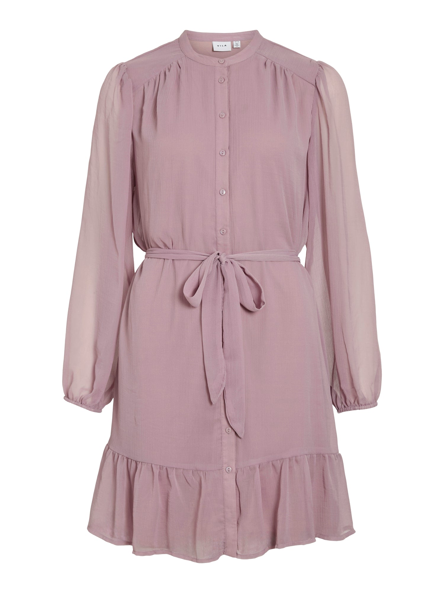 VESTIDODE MANGAS LARGAS , CIERR ECON BOTONES , LAZO EN LA CINTURA , VOLANTE EN EL BAJO ,CUELLO MAO , DOS CAPAS, MATERIAL TRANSPARENTE EN LAS MANGAS , COLOR DOS OPCIONES : LISO COLOR MALVA O ESTAMPADOS EN NEGRO Y BLANCO.