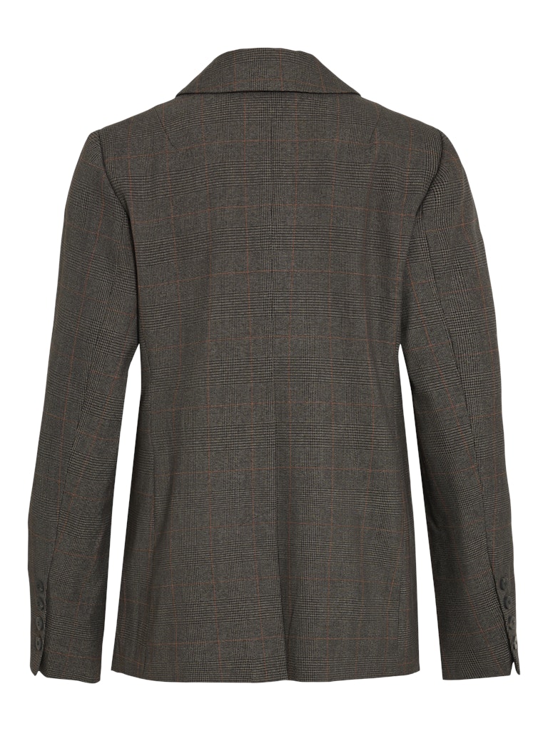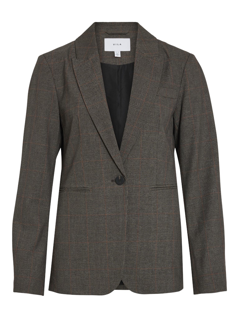 BLAZER CLÁSICA , FORMA PARTE DE UN CONJUNTO CON PANTALÓN , CIERRE CON BOTÓN , DOS BLSILLOS SEMI OCULTOS EN LA PARTE FRONTAL, ESTAMPADO DE CUADROS, CORTE REGULAR