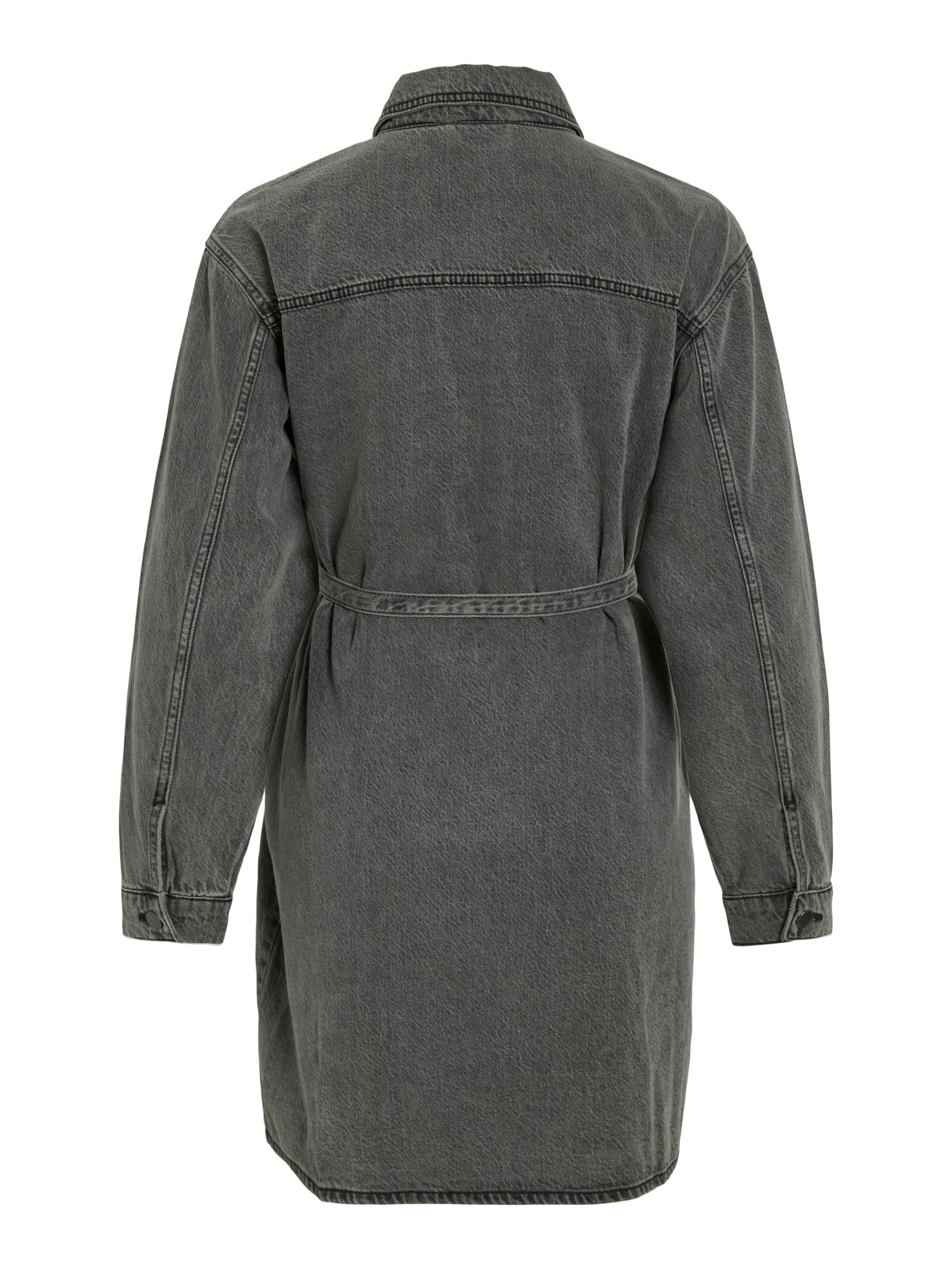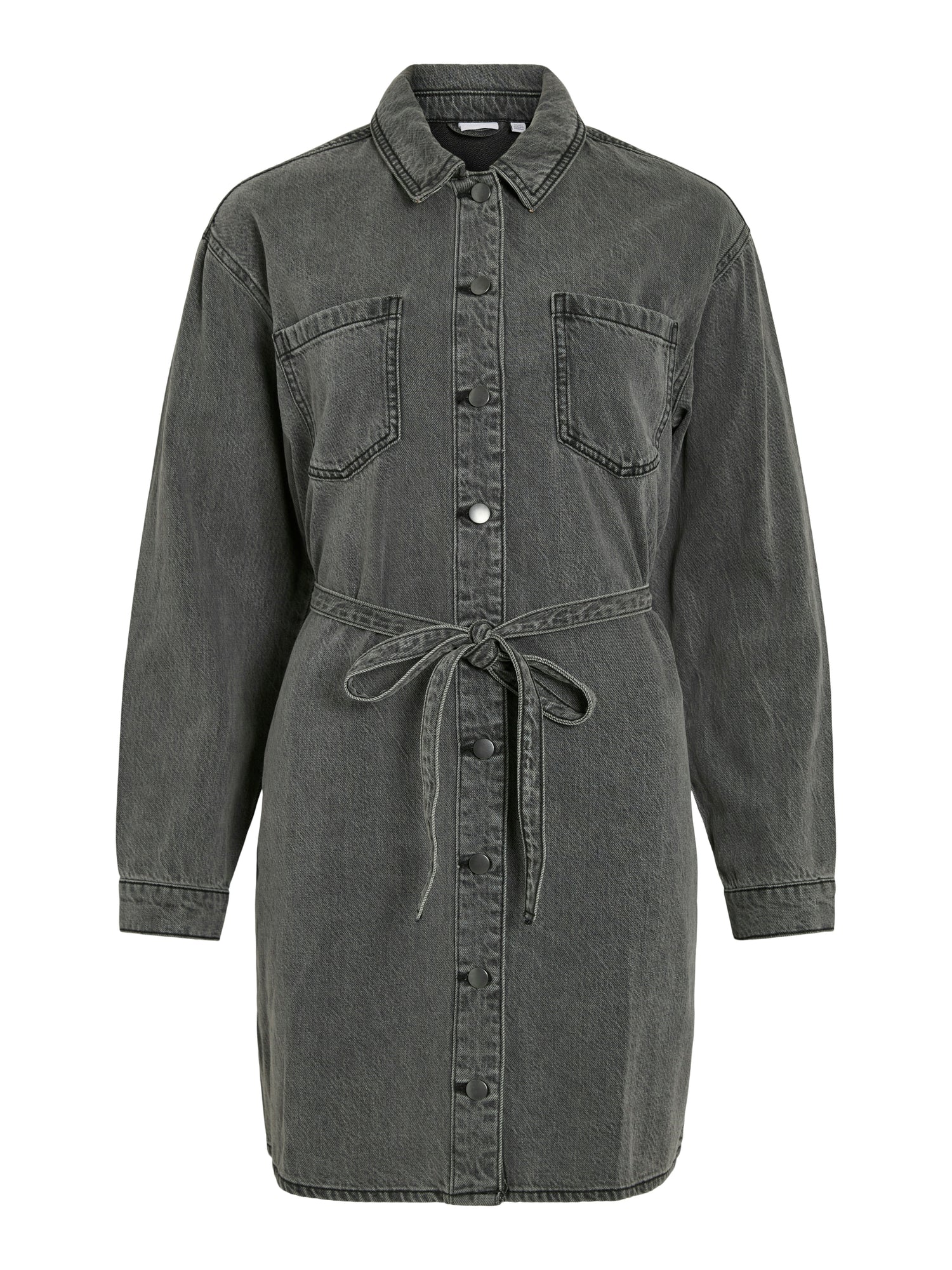 VESTIDO CAMISERO DE TELA VAQUERA, CORTO, MANGAS LARGAS, CIERRE FRONTAL CON BOTONES, LAZO EN LA CINTURA Y CINTURON DESMONTABLE, CORTE REGULAR