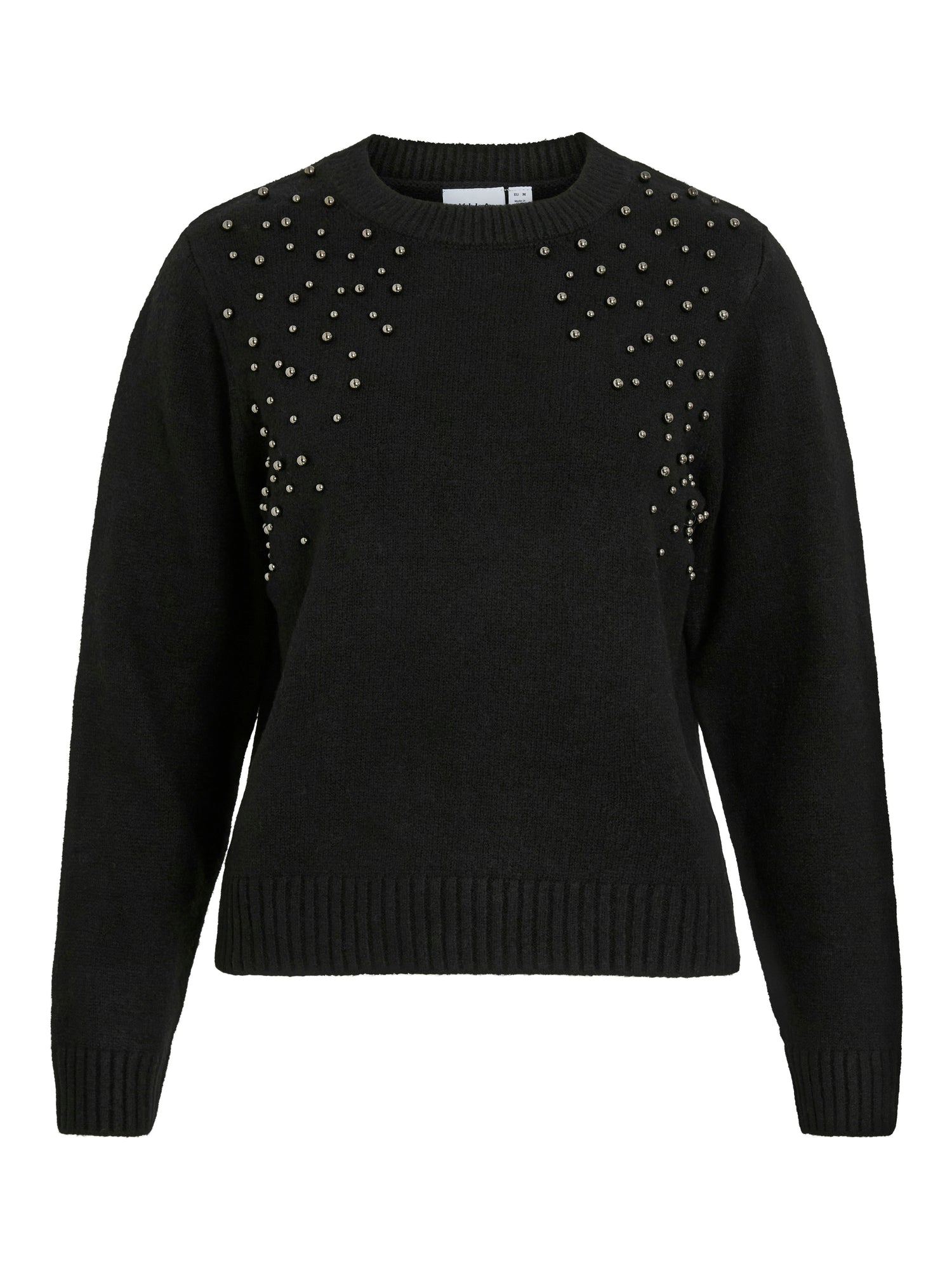 JERSEY DE PUNTO CON PEDRERÍA , CUELLO REDONDO, BORDES ACANALADOS, PUNTO SUAVE Y ELÁSTICO, CORTE REGULAR